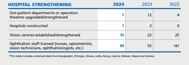 We invest in hospital equipment and infrastructure, provide training for healthcare professionals and establish vision centres at the community level. The vision centres provide eye exams and eyeglasses and refer patients to the base hospital for surgery or other treatment.